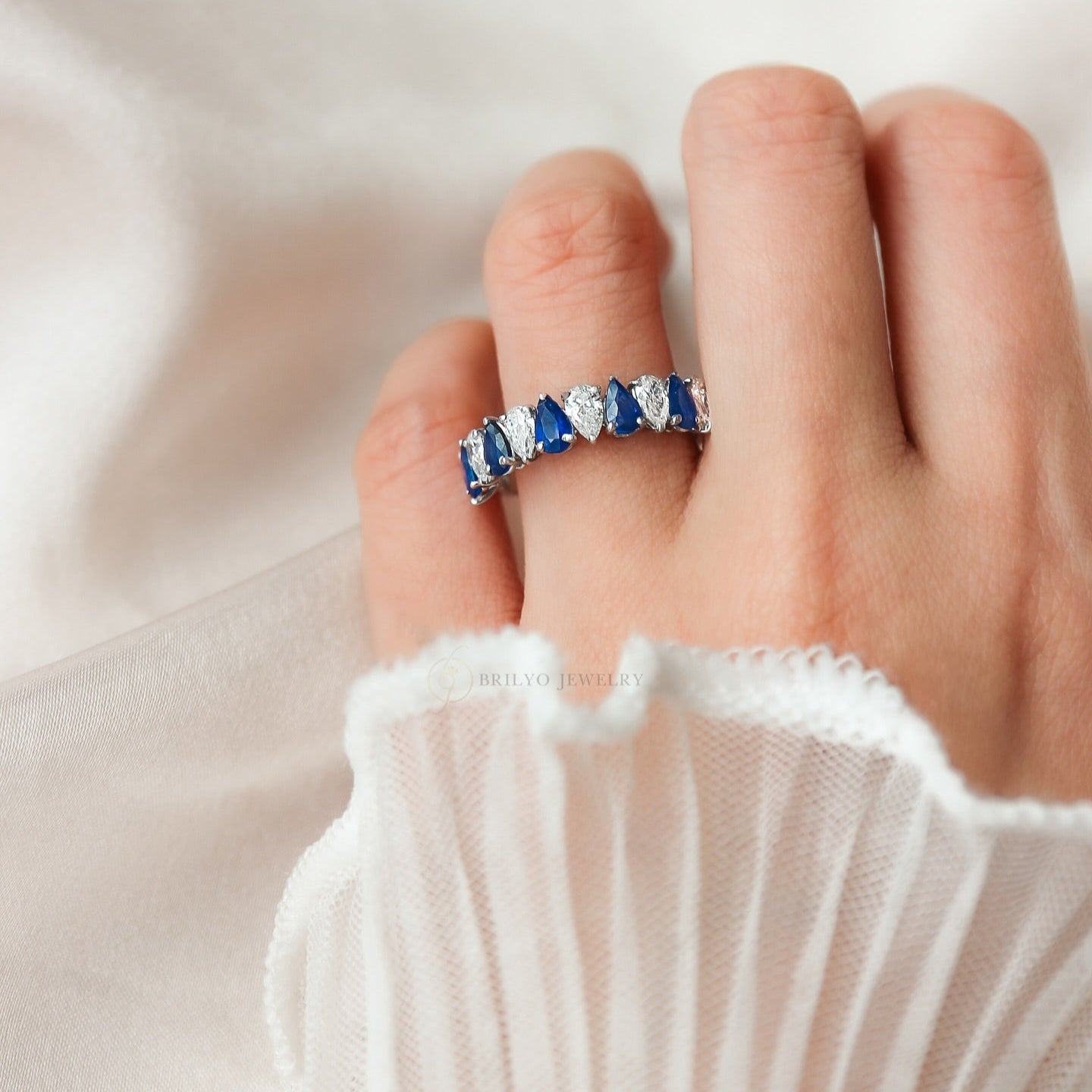 A vibrant symphony of color and brilliance — this exquisite ring features pear-cut GH VS earth-mined diamonds intertwined with pear-cut treasures: natural emerald, ruby, and sapphire. A striking design that celebrates elegance, diversity, and timeless beauty.