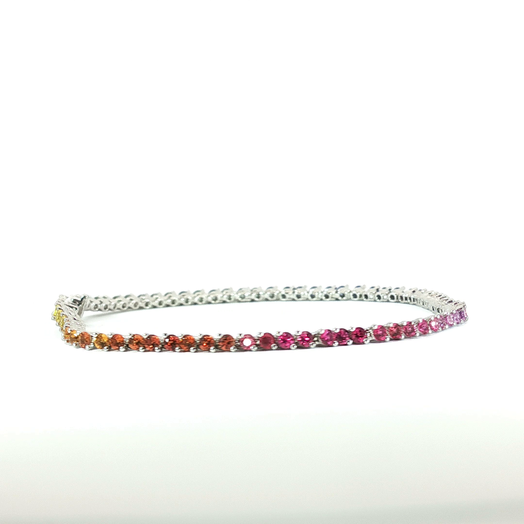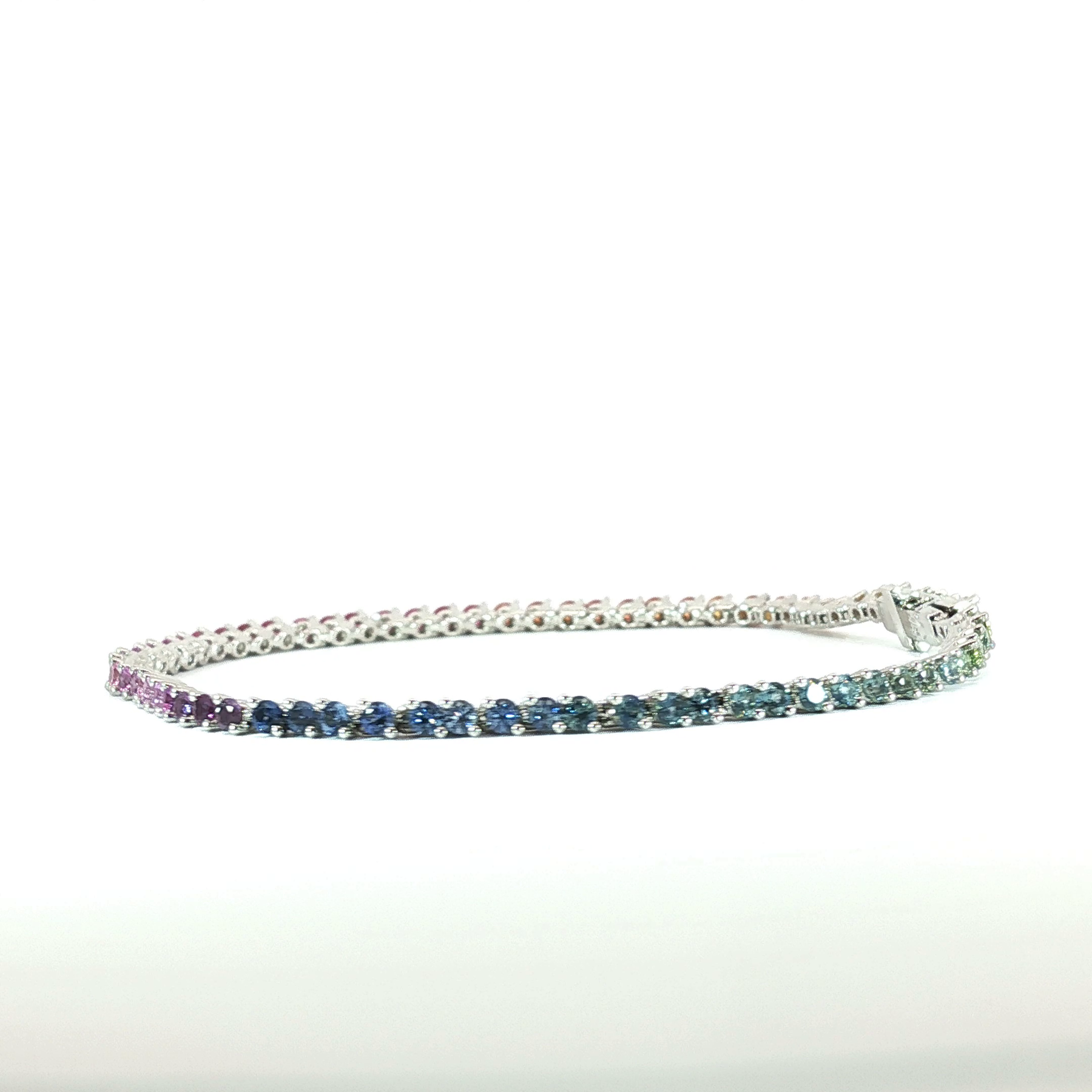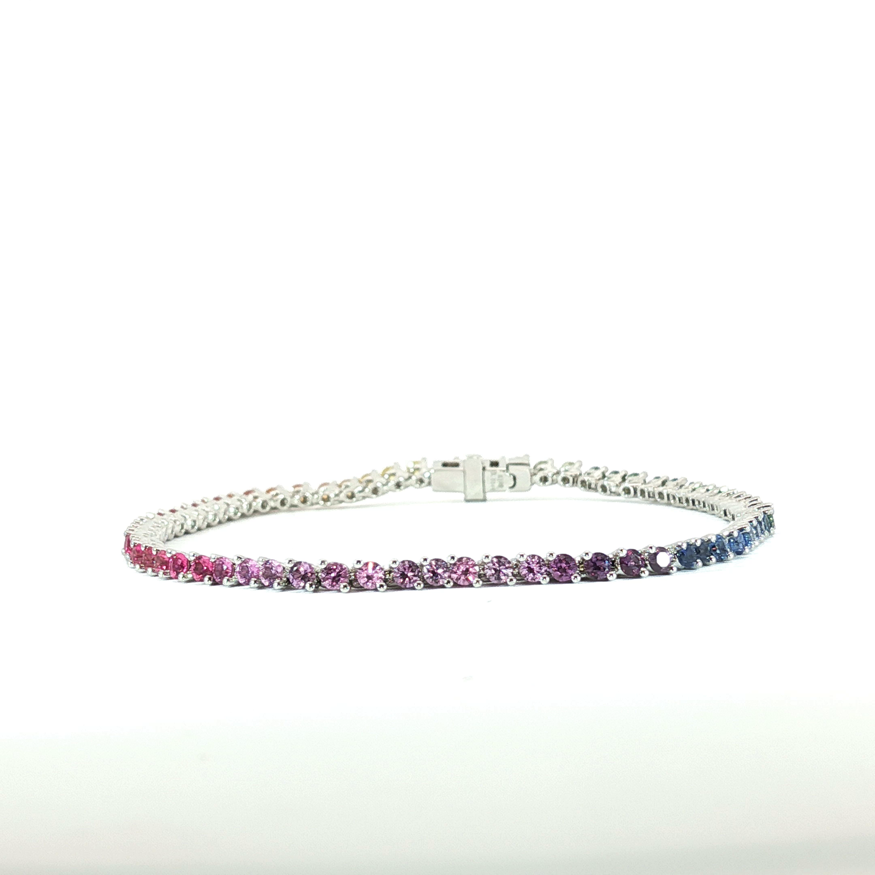 A dazzling 3.01tcw round natural sapphire tennis bracelet, crafted in luxurious 18k white gold for timeless sophistication.