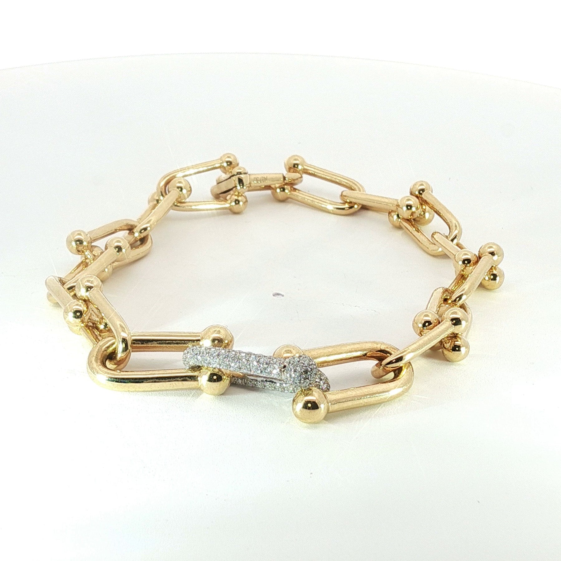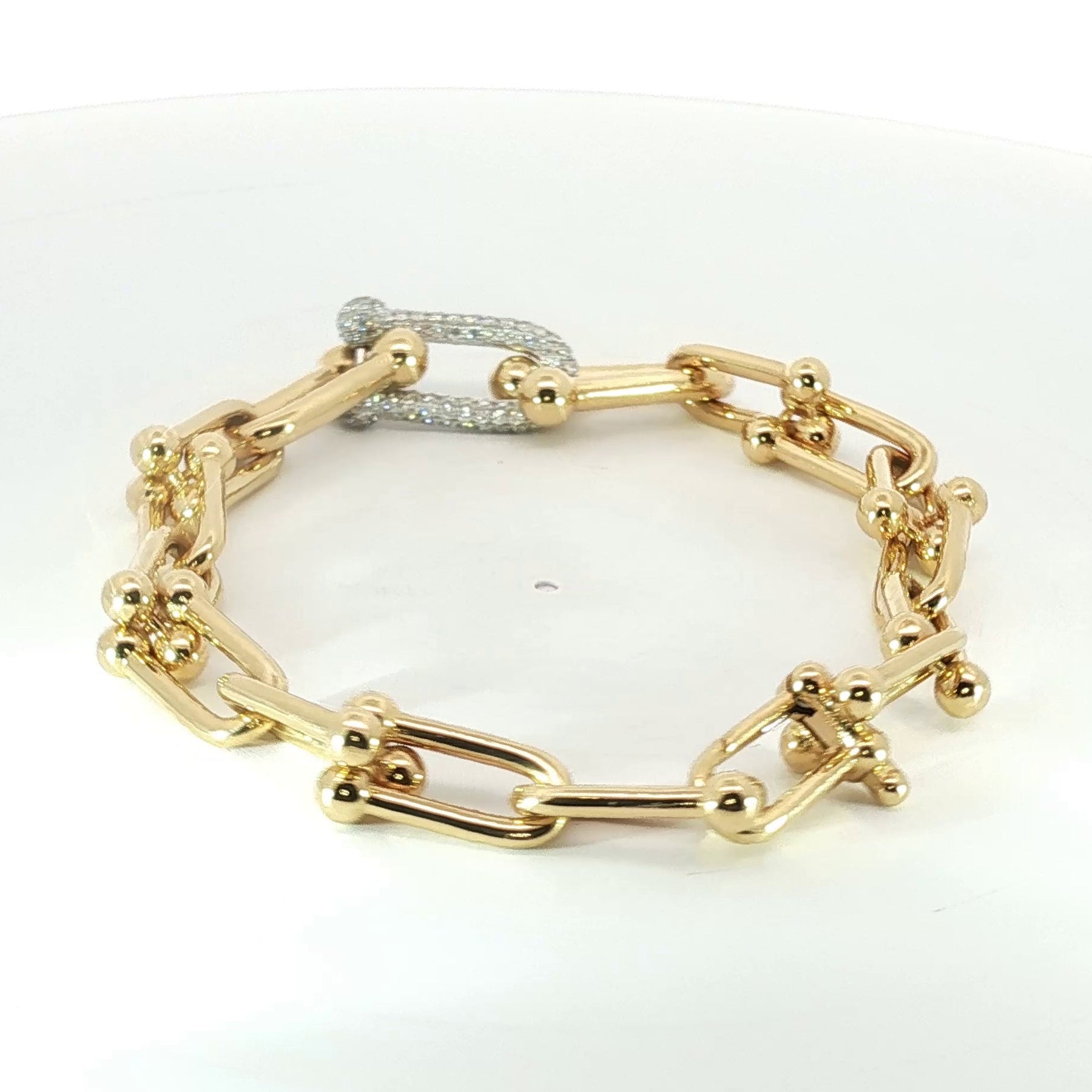 A bold yet elegant 7-inch paper-clip bracelet crafted in solid 18k yellow gold, featuring 1ct of brilliant round earth-mined diamonds. Weighing 11.1g, this thick, luminous piece blends modern luxury with timeless sparkle.