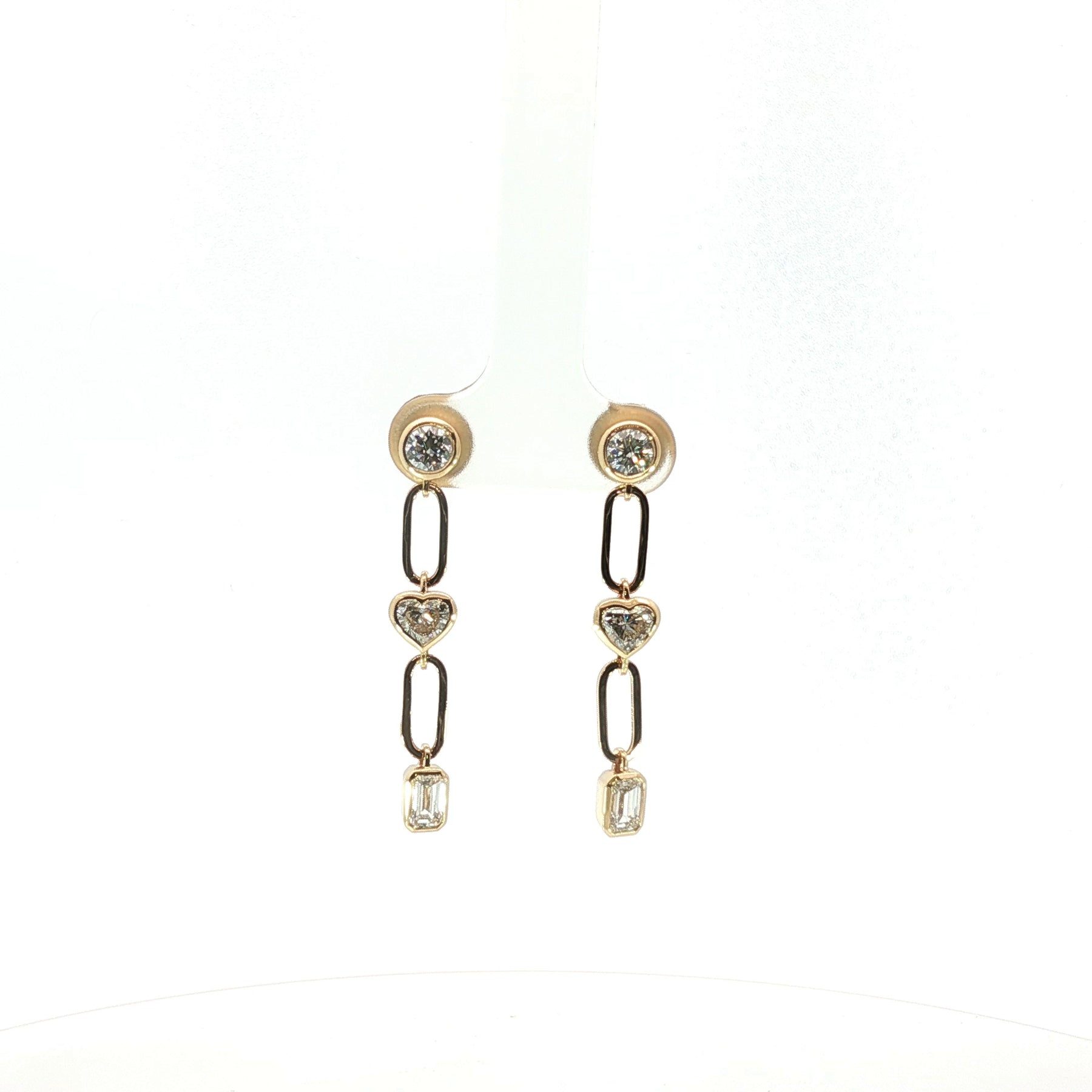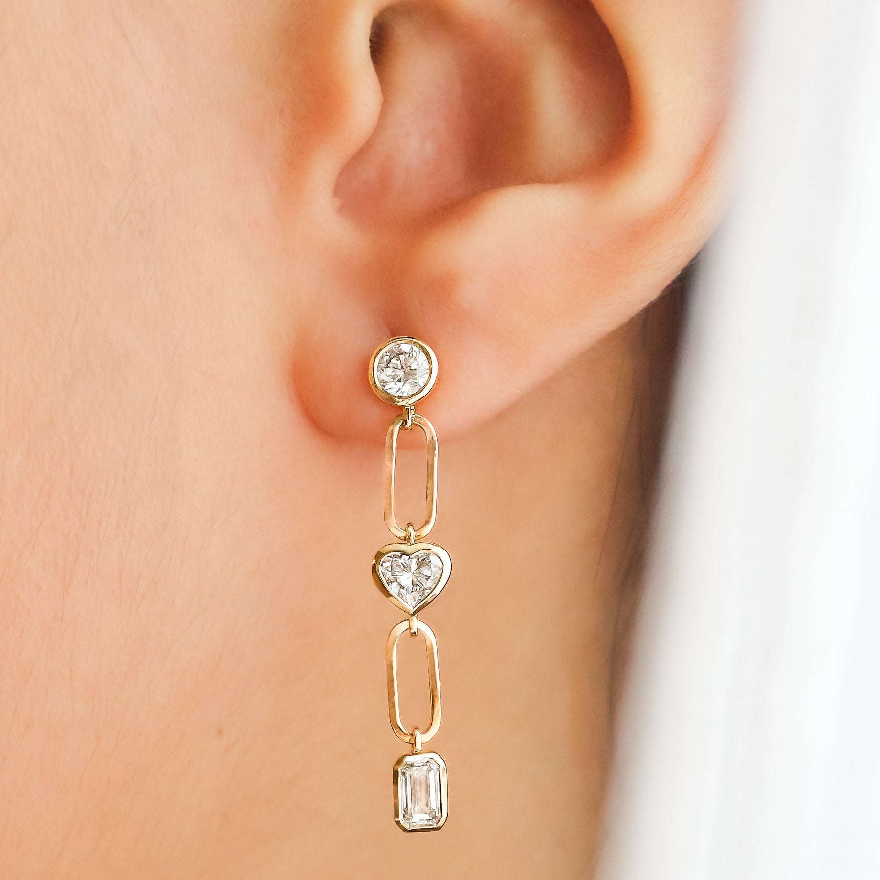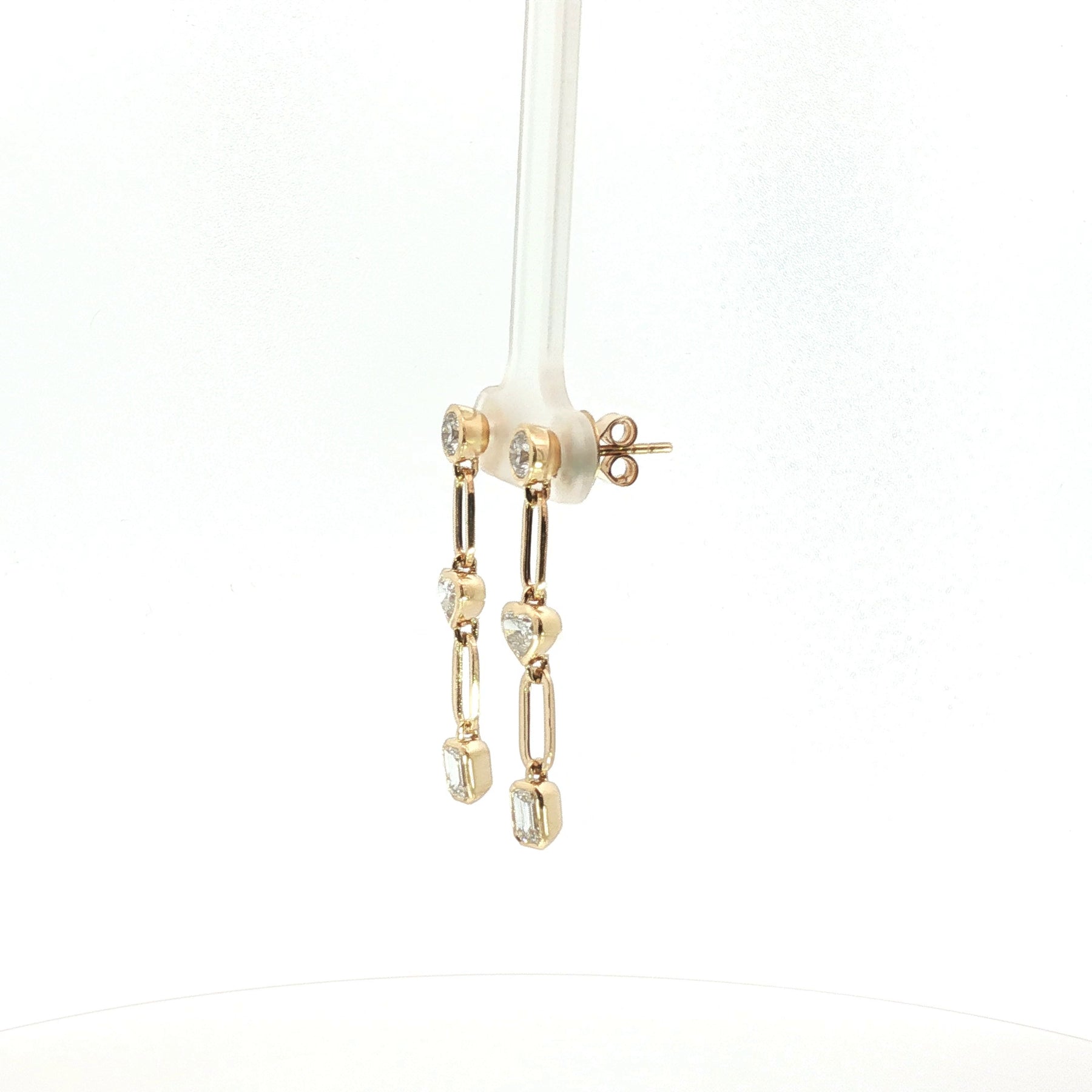 A dazzling 2.03tcw assortment of DEF color, VVS–VS clarity lab-grown diamonds in round, heart, and emerald cuts, set as elegant dangling earrings in 18ky. A perfect blend of sophistication and ethical luxury, crafted to elevate any look with radiant brilliance.