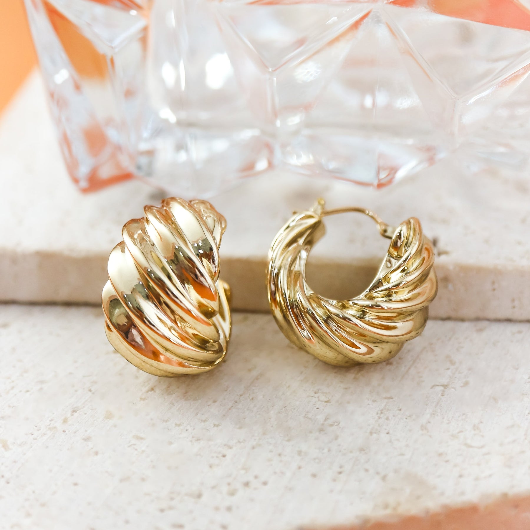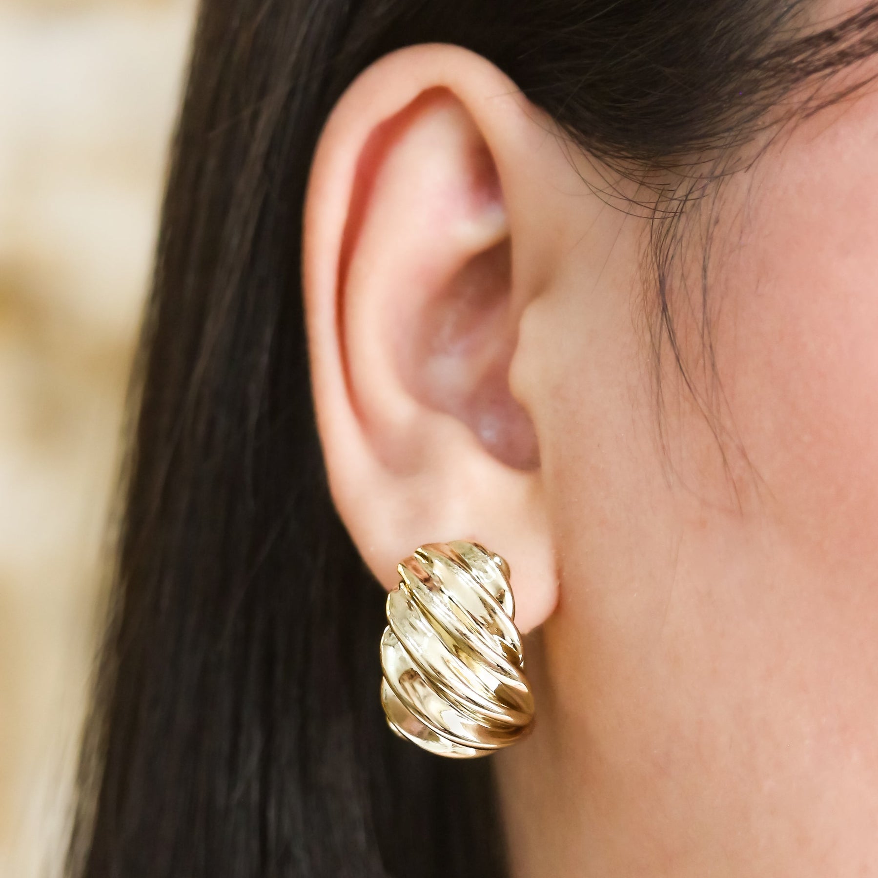 Crafted in luminous 18K yellow gold, these Croissant Earrings capture the timeless elegance of French-inspired design. Each earring features a softly sculpted, twisted silhouette reminiscent of a perfectly layered croissant, creating a look that is both refined and effortlessly stylish. The smooth, high-polish finish enhances the natural curves, allowing the gold to catch the light beautifully with every movement.