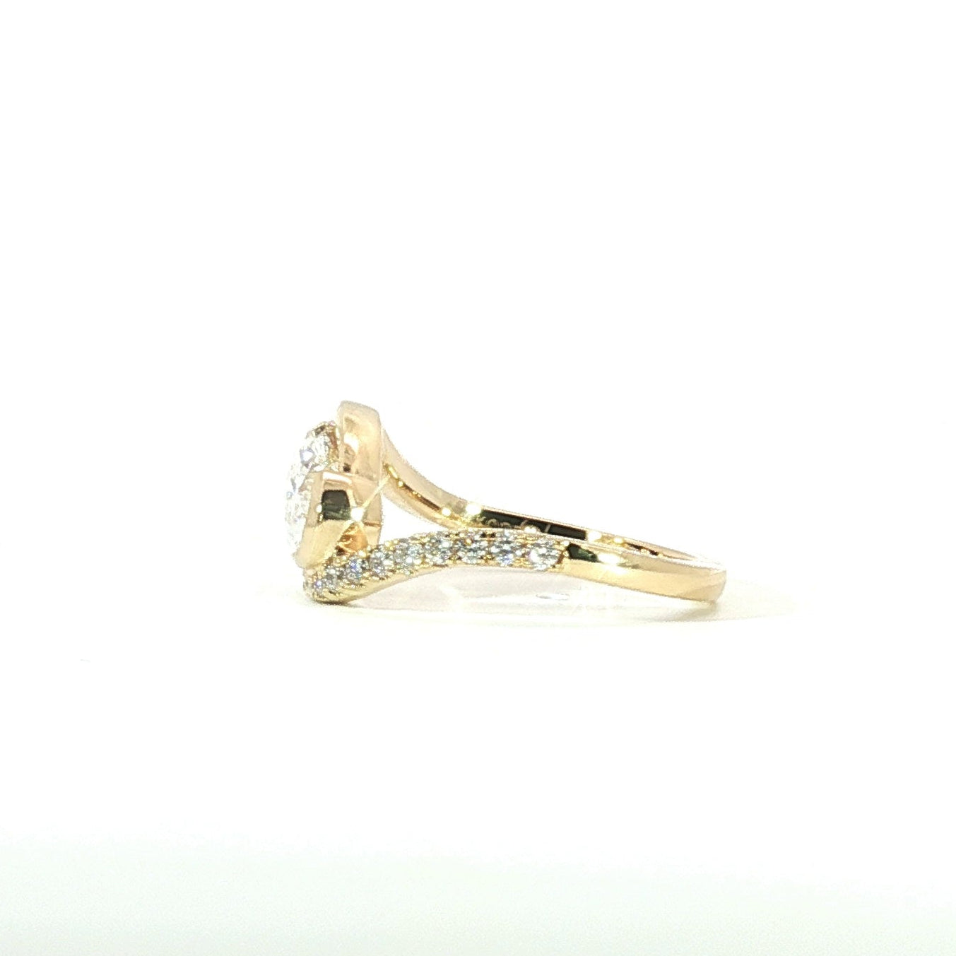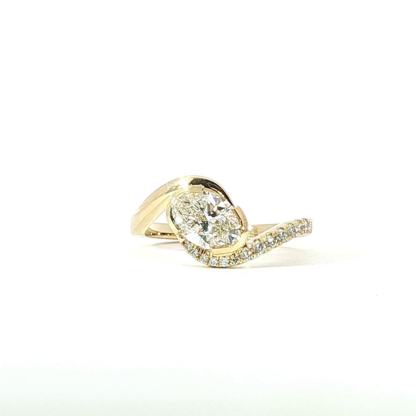 A stunning 1.09ct F color, VVS2 clarity oval cut lab-grown diamond with 0.15tcw DEF VVS-VS round accents, IGI certified and set in size 6.5 in 18ky.