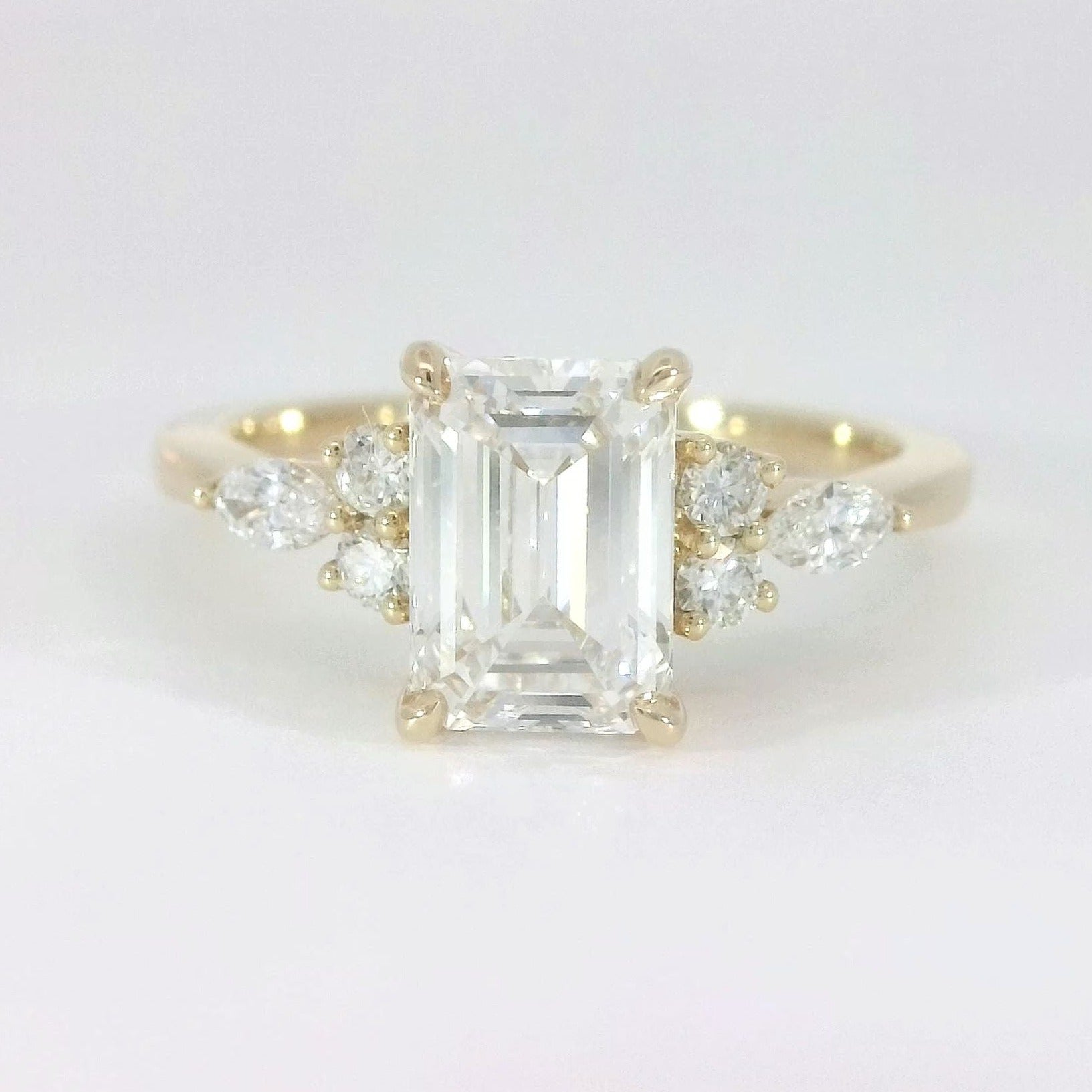 This engagement ring exudes vintage elegance with a set in a classic four-prong setting. Sophisticated look with a hall-of-mirrors effect due to its step-cut facets. Effulgent metal ribbons grow around the center diamond to an elegant cradle of claw prongs. Flanking the center stone are beautifully arranged marquise and round brilliant diamonds, adding a floral or clustered effect that enhances the overall brilliance and uniqueness of the ring.