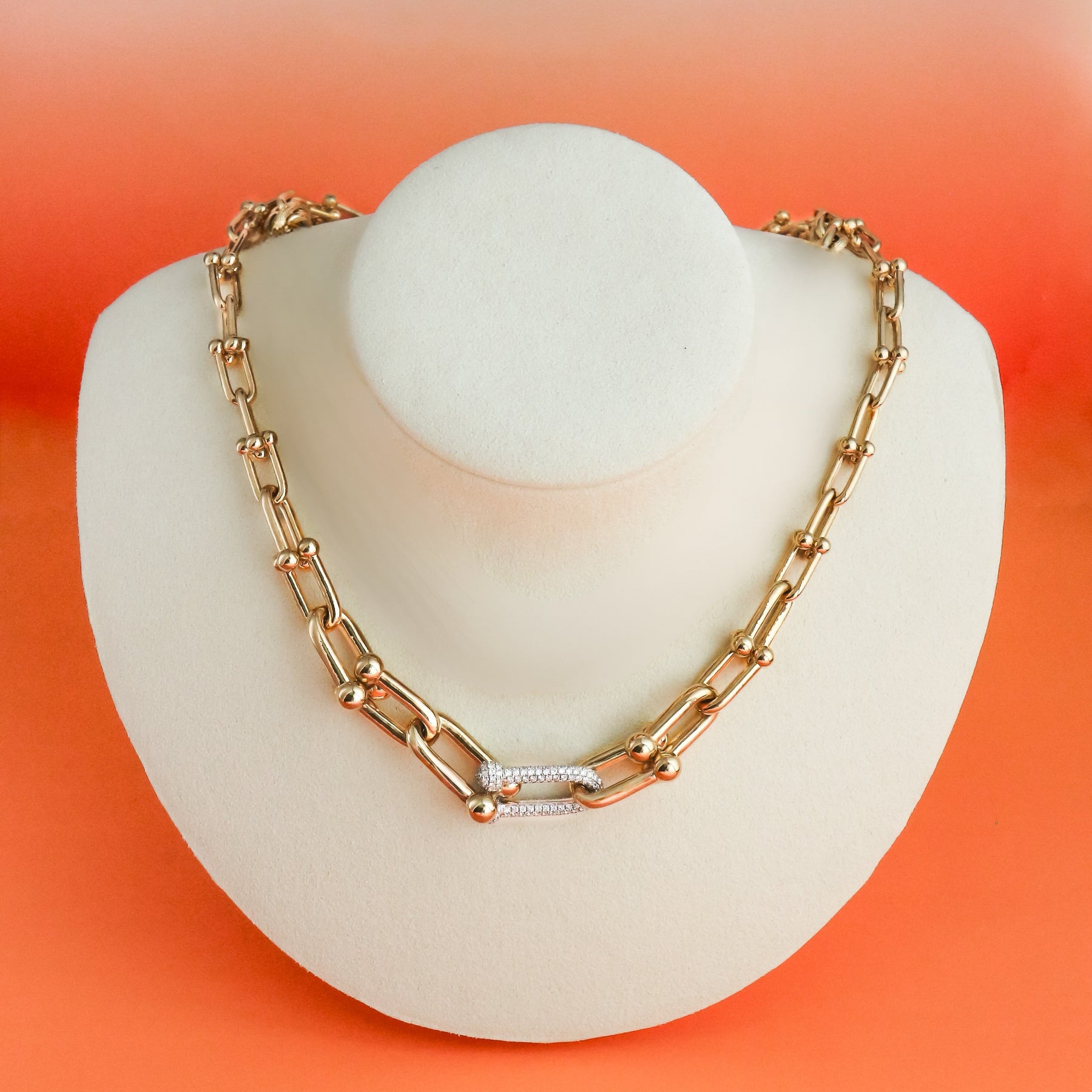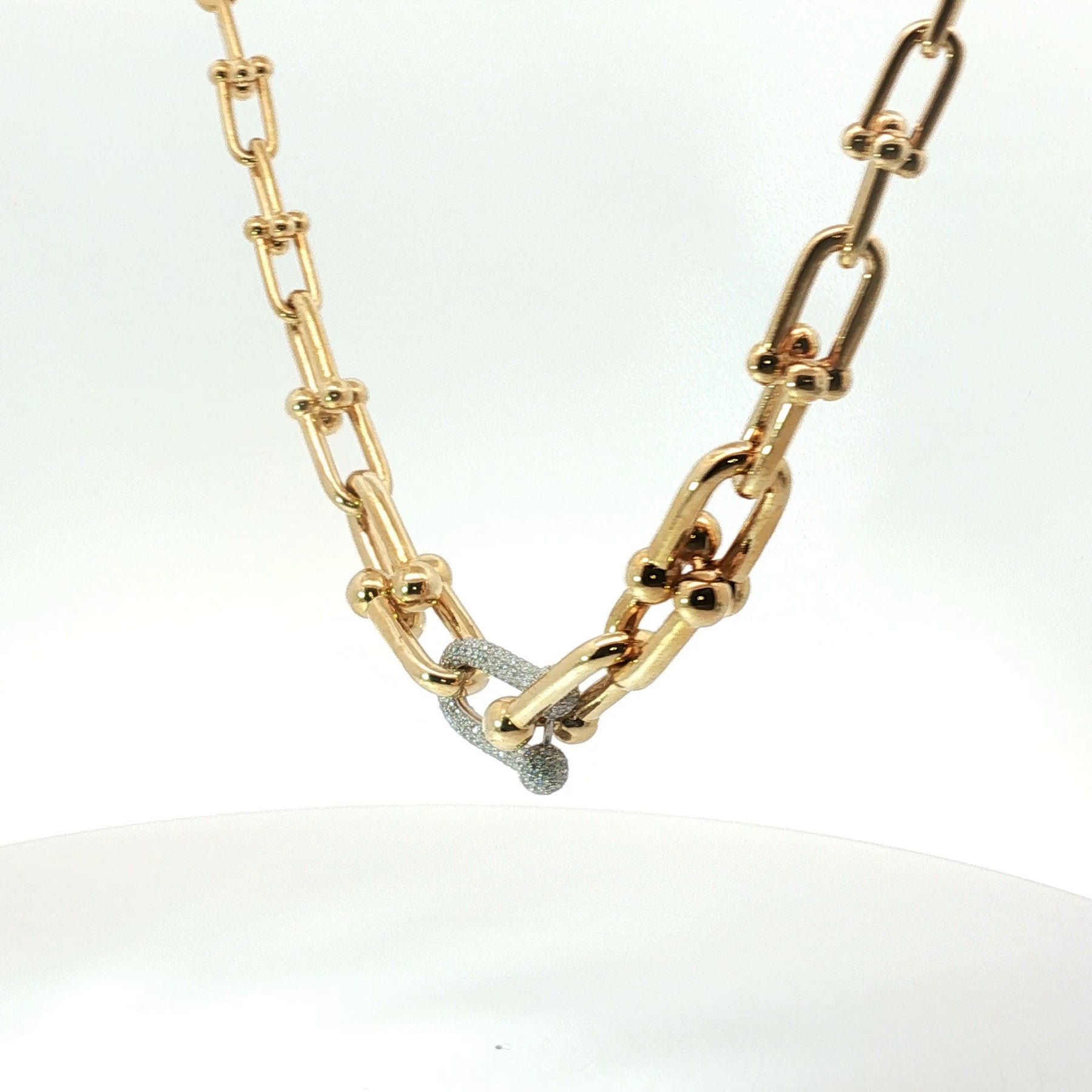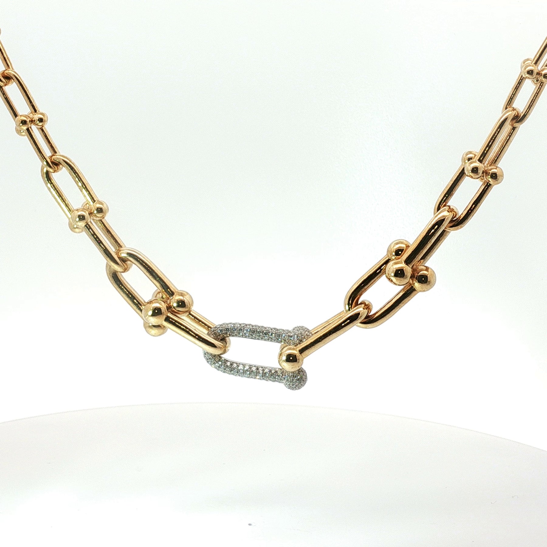 This thick paper-clip necklace combines 18K yellow gold with radiant, earth-mined diamonds totaling 1.8ct. Its impressive weight adds a sense of power and refinement to any look. A stunning blend of contemporary style and timeless brilliance.