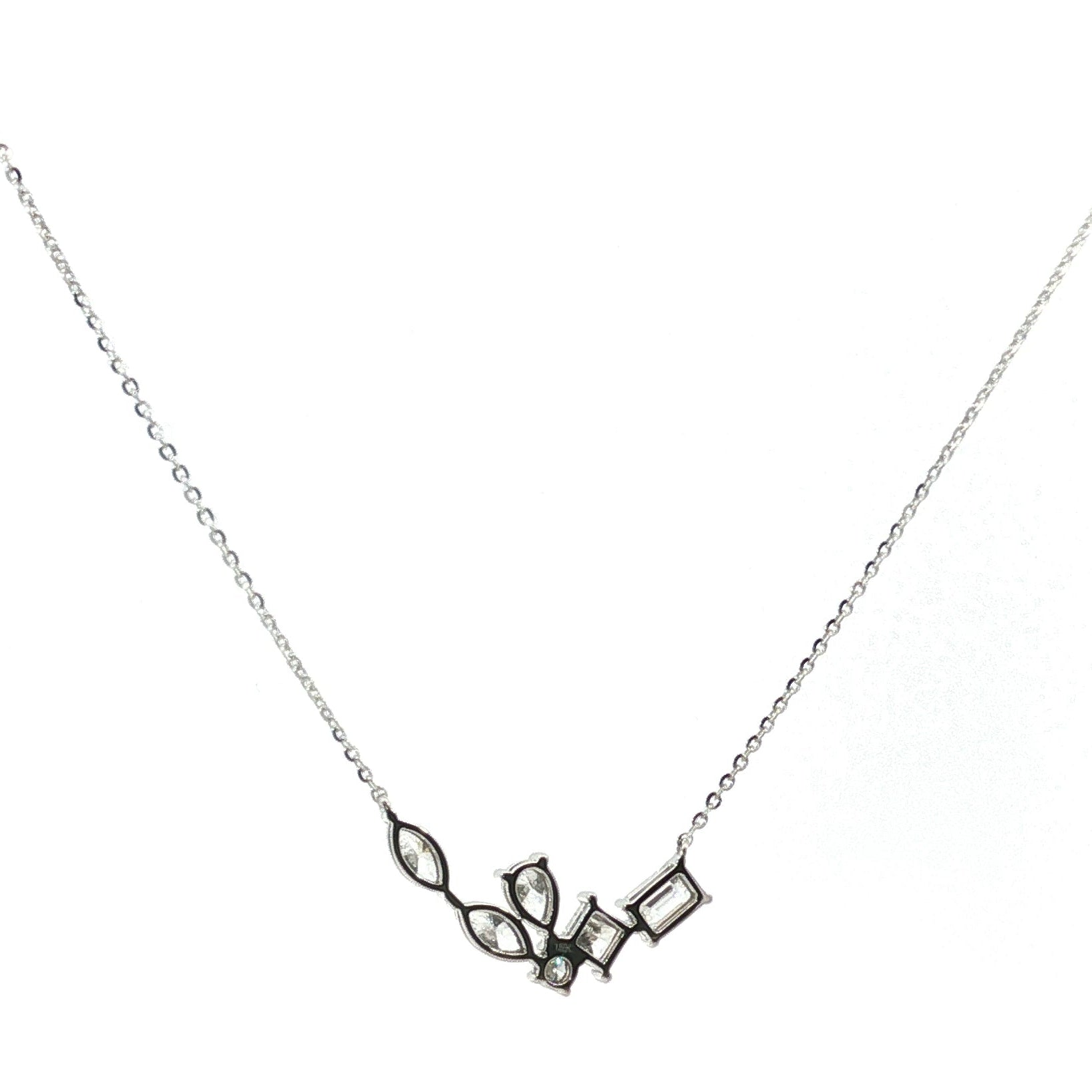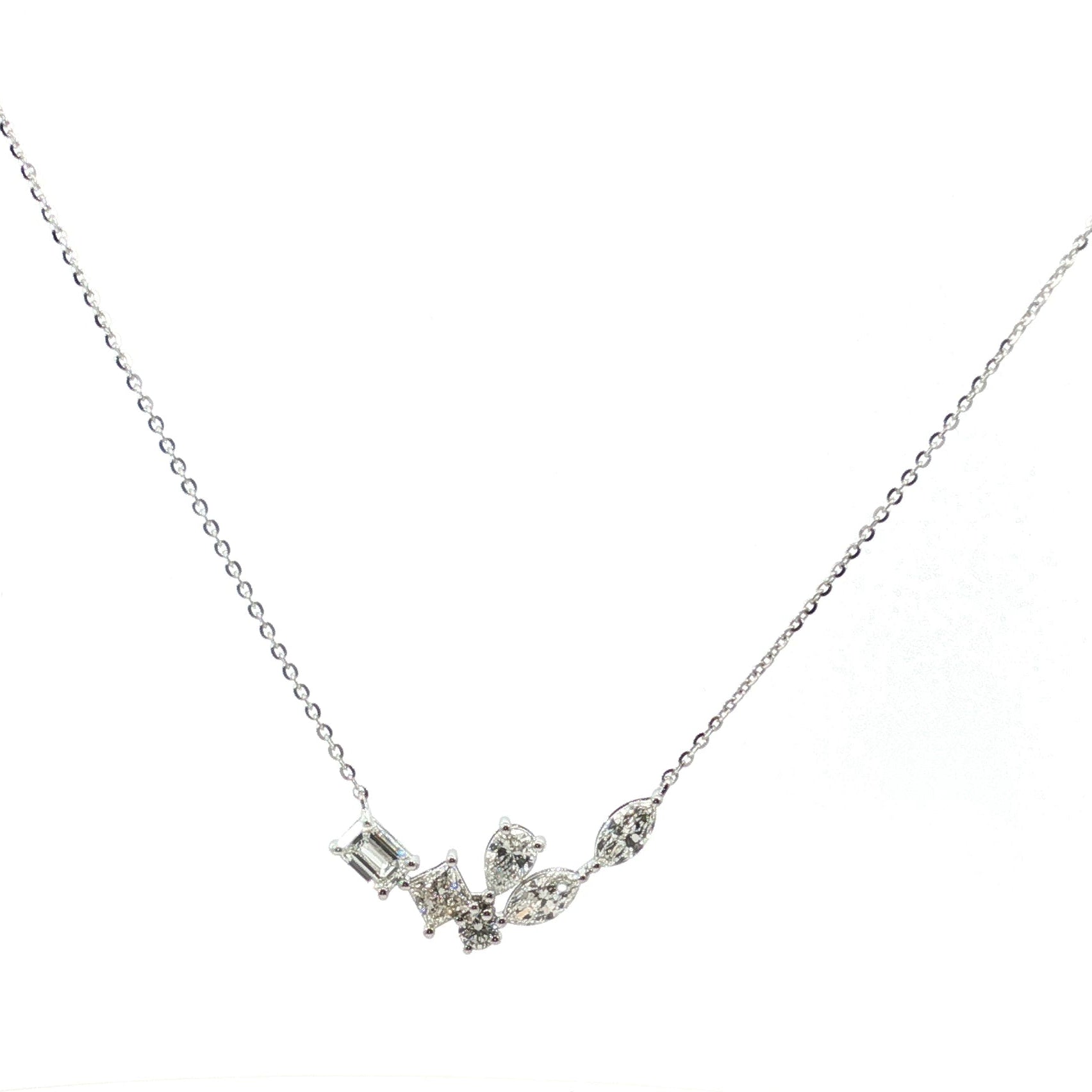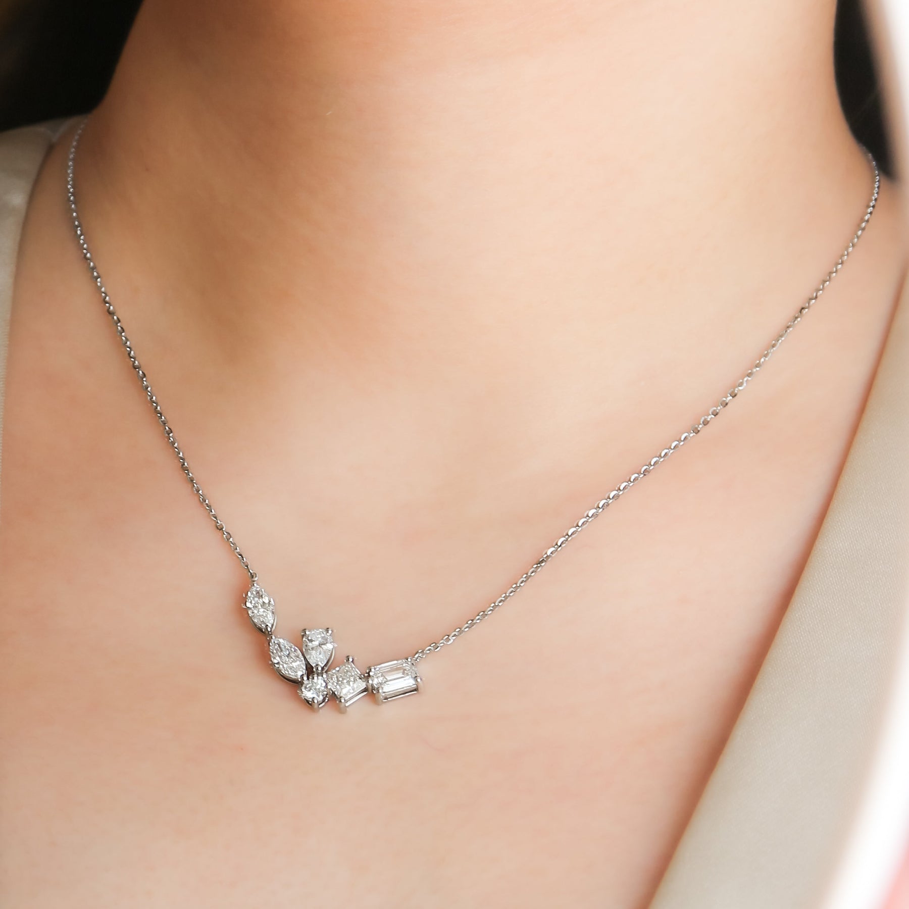 A glamorous 2.79tcw multi-shape cluster pendant necklace in 18k white gold, showcasing a mix of emerald, pear, princess, round, and marquise-cut stones.