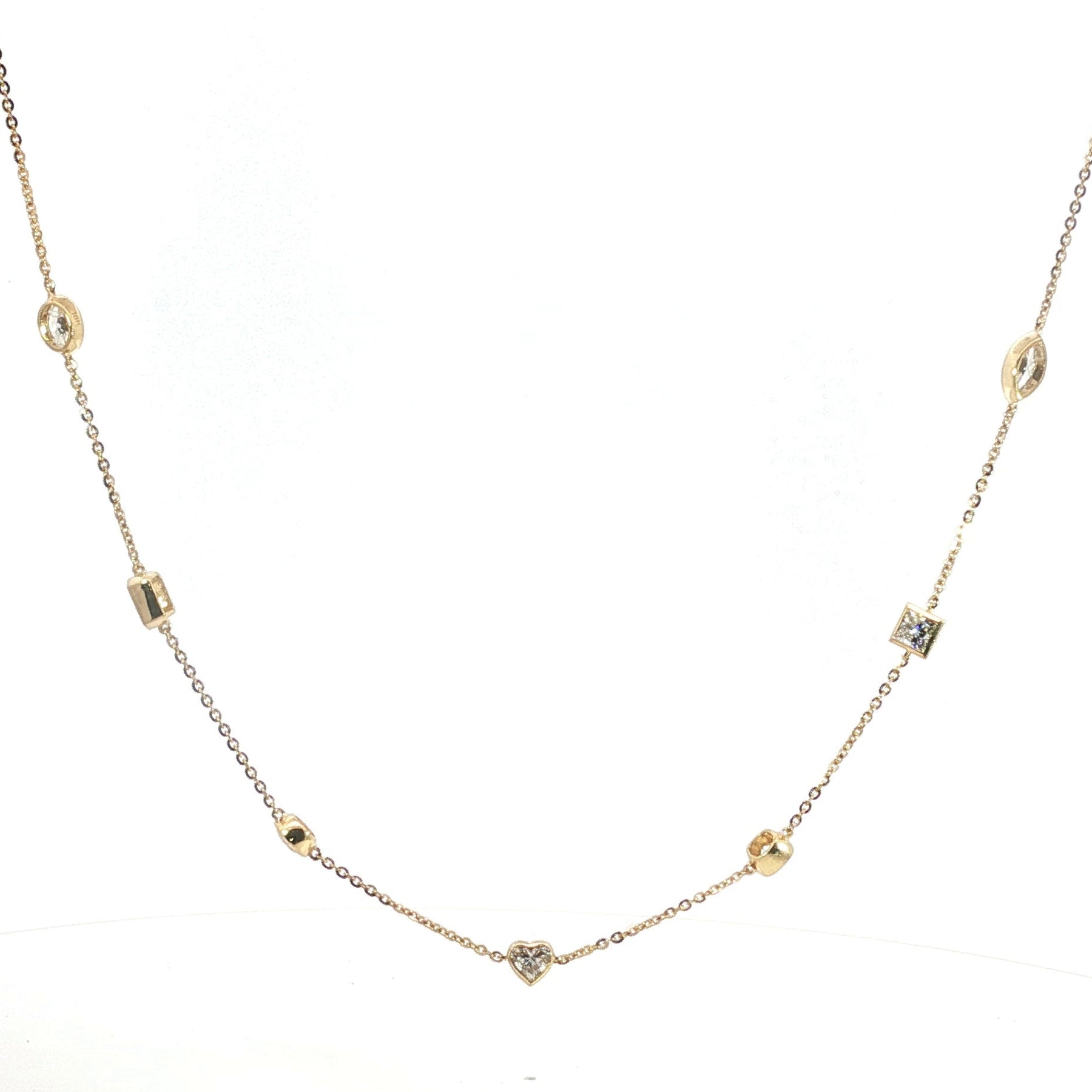This luxurious 18K yellow gold necklace features approx. 2.24tcw of lab-grown diamonds in a mix of marquise, princess, cushion, heart, round, radiant, and oval cuts. With DEF color and VVS–VS clarity, the necklace shimmers with multidimensional sparkle. A timeless design perfect for statement-making elegance.