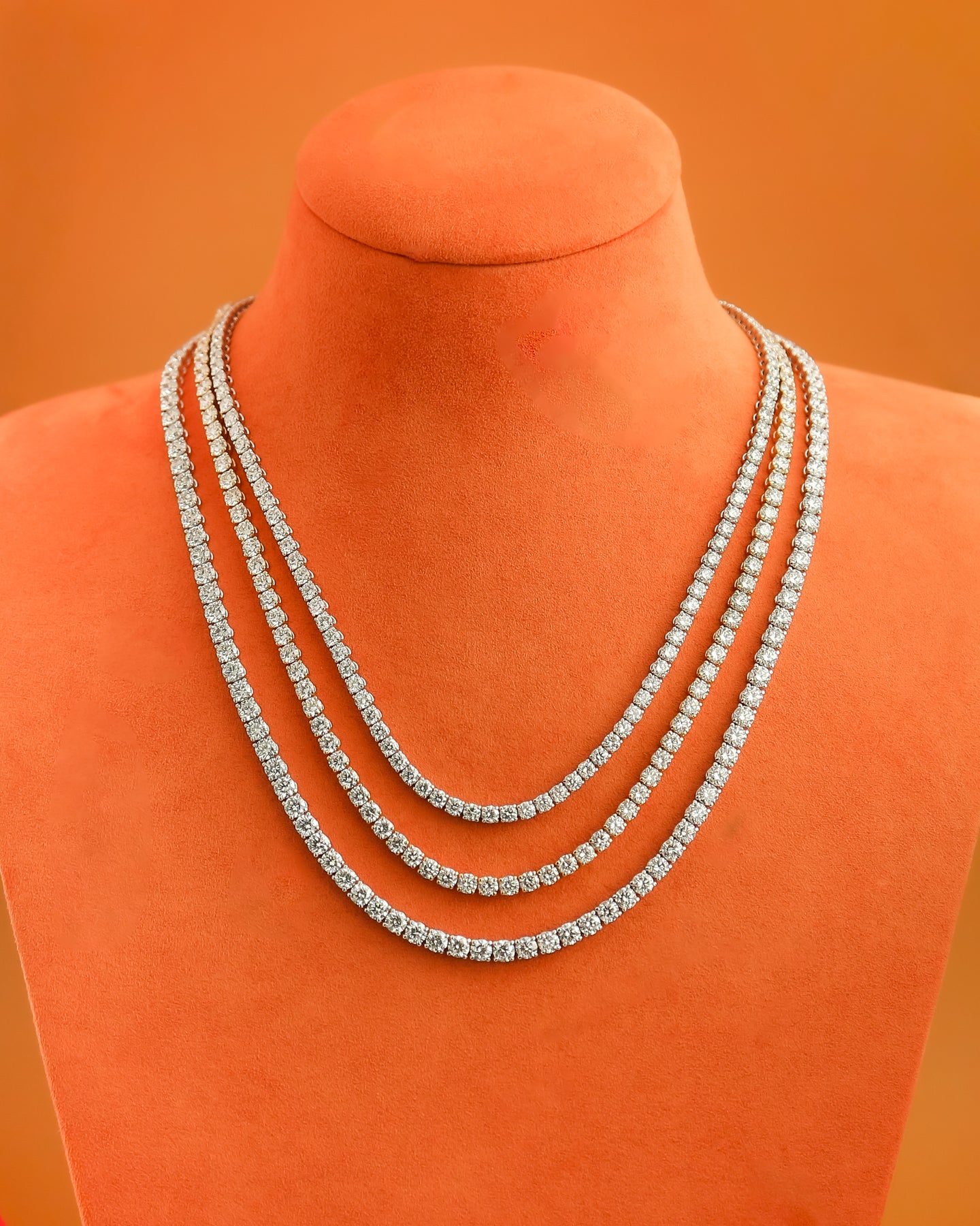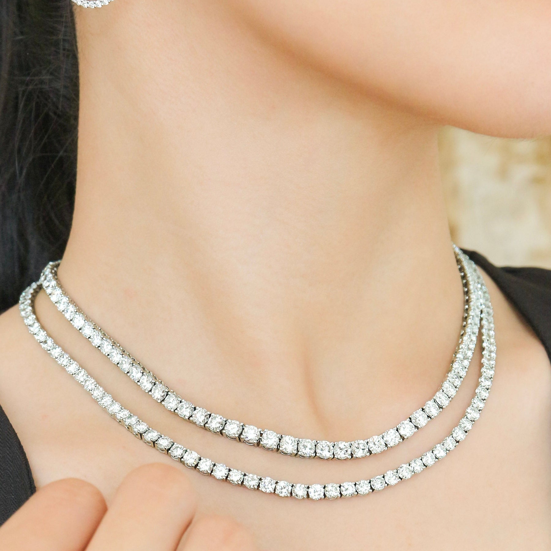 The elegant design showcases the brilliance of each diamond, offering a timeless and sophisticated piece that adds a dazzling touch to any jewelry collection. It appears to be a classic diamond tennis necklace set in a White Gold Metal. The brilliance and uniformity of the diamonds give it a timeless and elegant appeal. If you're considering wearing or gifting it, it's a perfect choice for adding sophistication and luxury to any outfit.