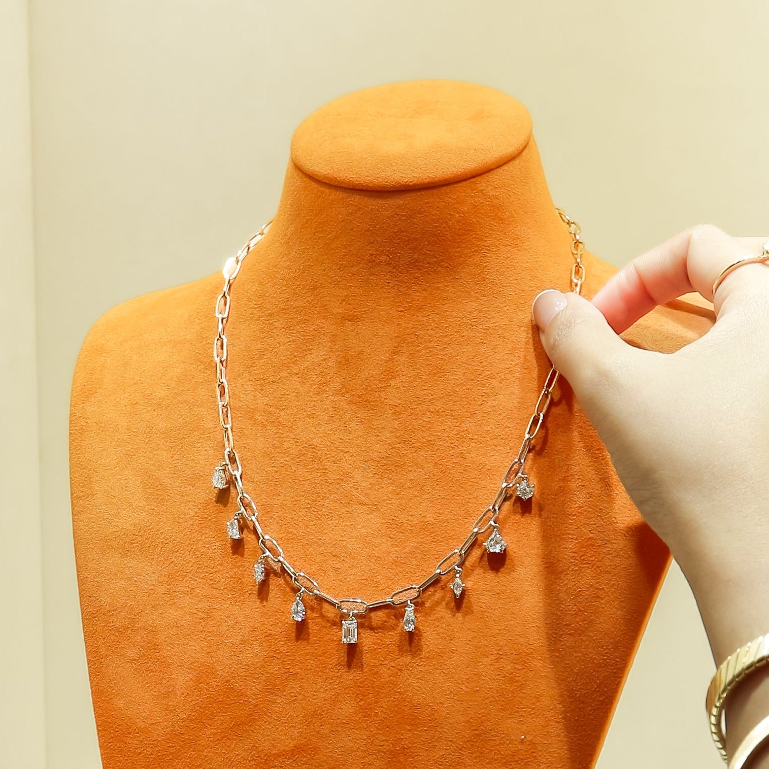 A bold yet refined 18K yellow gold paperclip chain necklace adorned with approx. 3.52tcw of DEF VVS–VS lab-grown diamonds in multiple shapes. The combination of modern chain design and sparkling diamonds creates a versatile, statement-making piece. Timeless luxury with a contemporary twist.