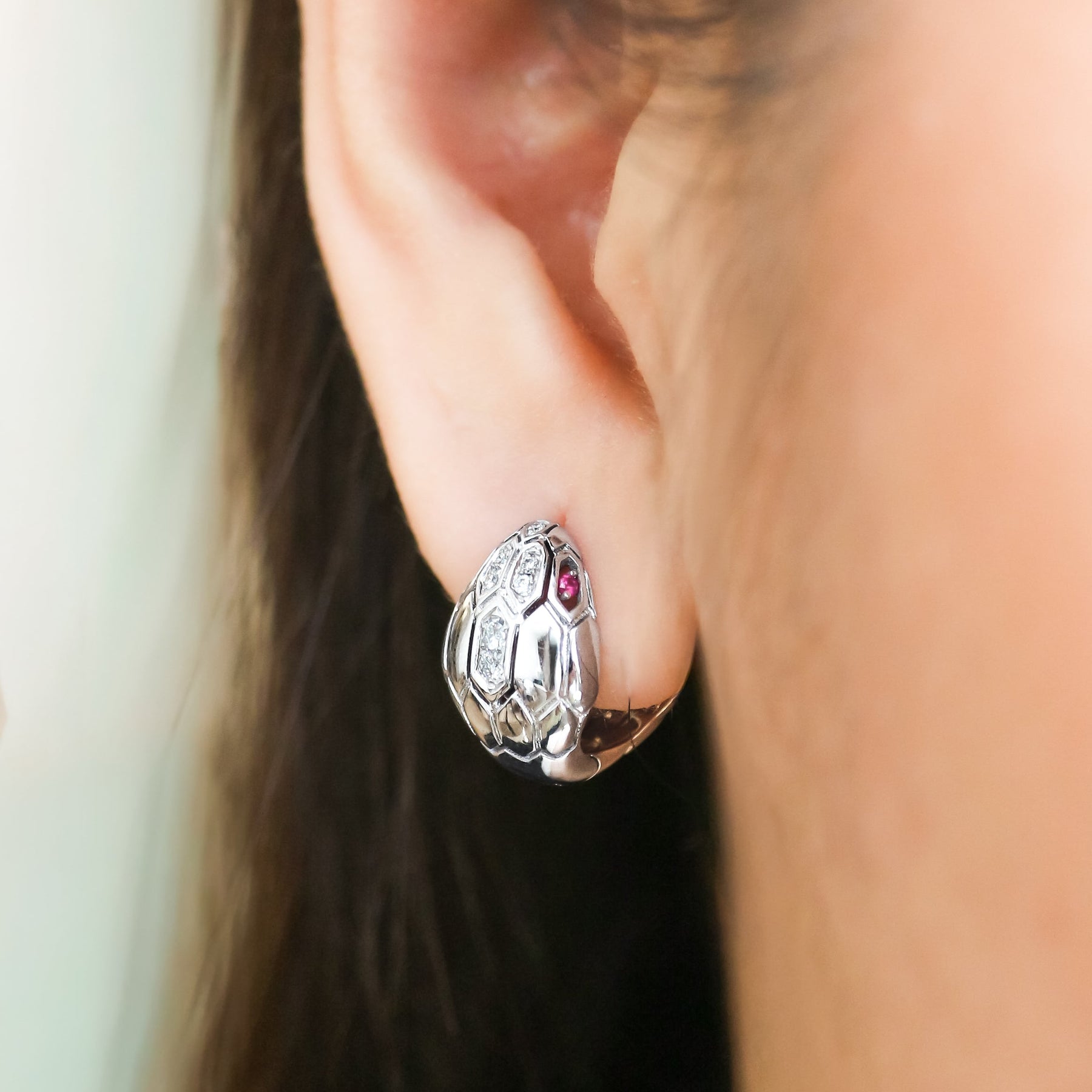 0.022tcw Natural Ruby with 0.048tcw EF-VVS-VS Earth Mined Diamonds Snake Hoops Earrings in 18kw and 18ky.