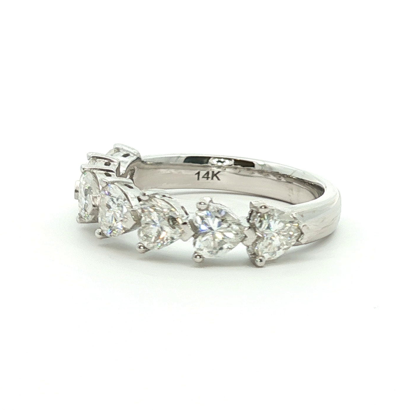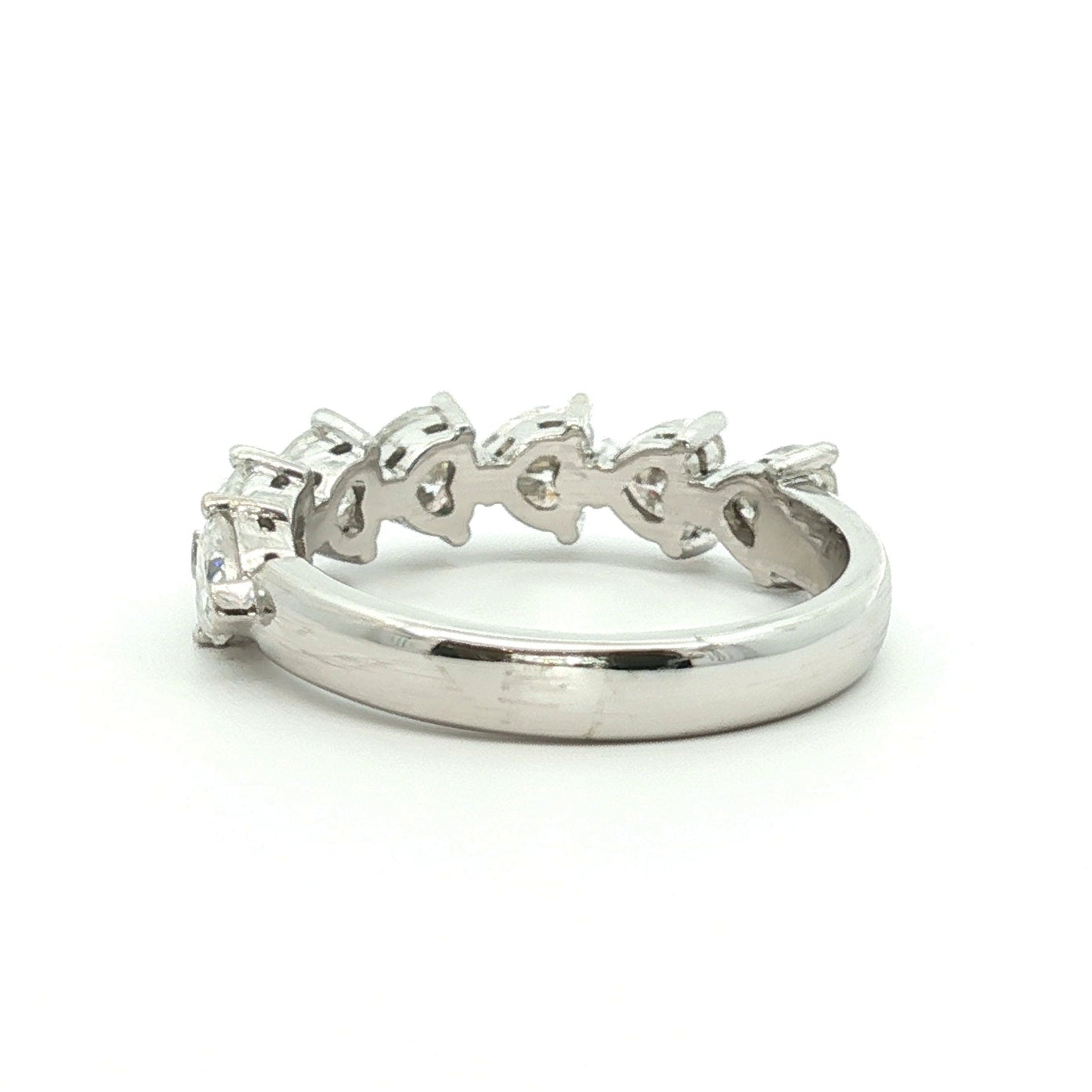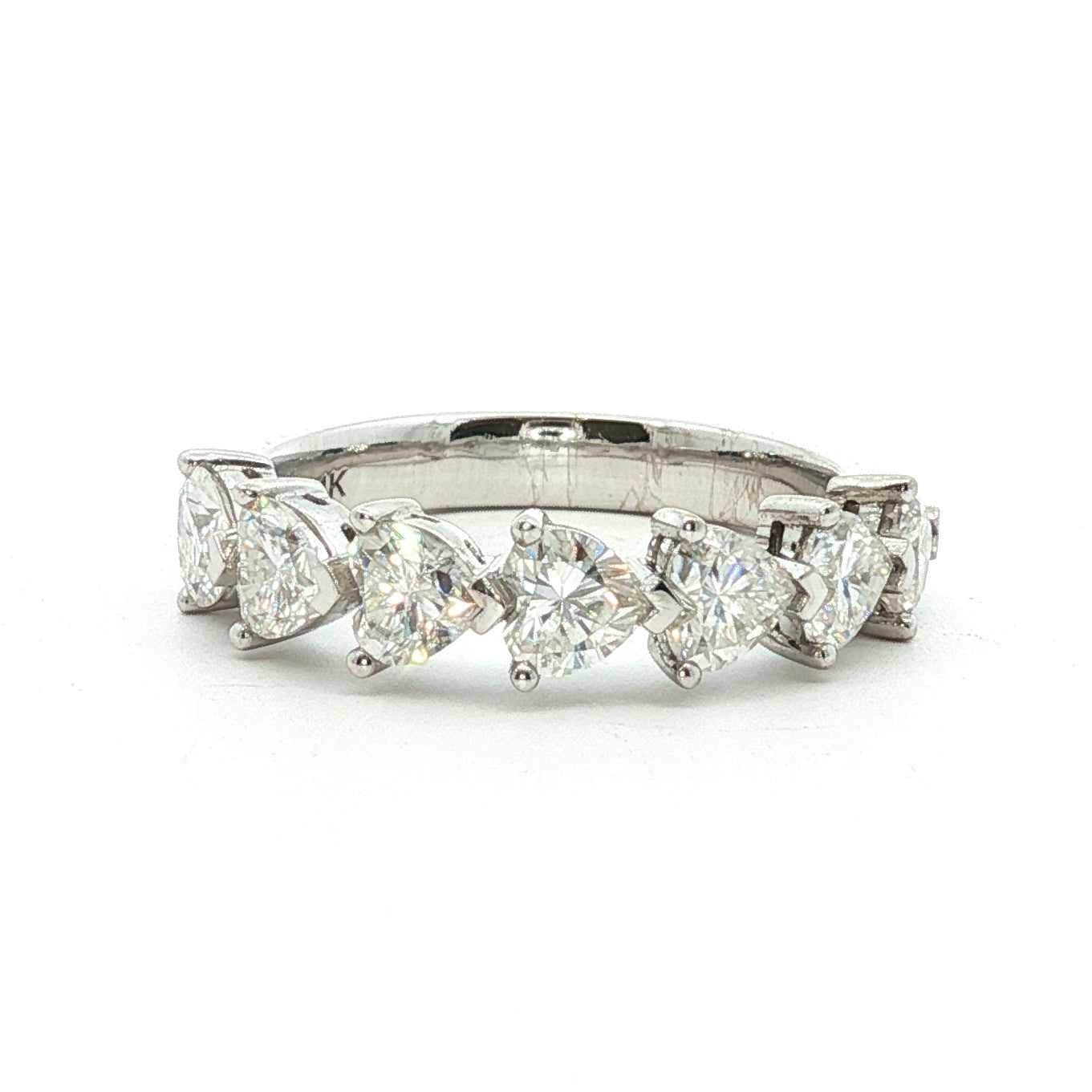This exquisite Heart Eternity Ring showcases seven 0.25-carat heart-cut Brilyo Moissanite stones, intricately set in a continuous band design. The heart-shaped stones exude a romantic and timeless allure, while the brilliance of the Moissanite provides exceptional sparkle, making this ring an ideal symbol of love and commitment.